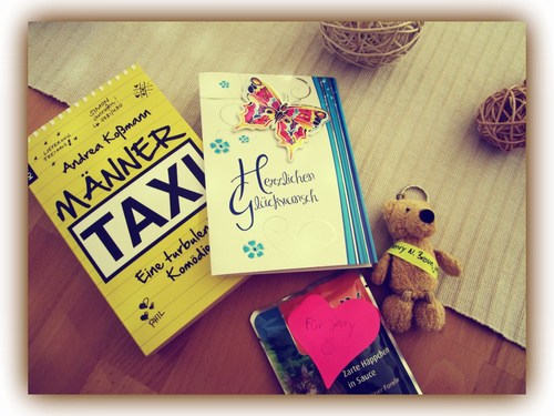 Heute erreichten mich gleich zwei Überraschungspäckchen! Das erste ist von der lieben Kerstin. Eigentlich wollte sie mir „nur“ das Männertaxi zum Signieren schicken, doch dann gratulierte sie mir, bzw. Kossis Welt, noch zum 6. Geburtstag, packte auch noch ein Leckerchen für Jerry dazu und dann war da noch dieser kleine süße Bär … Schaut mal: