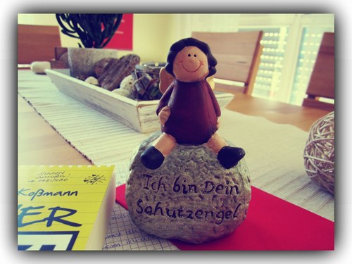 Ich weiß nicht, ob ihr es erkennen könnt, aber auf dem Stein glitzert und funkelt es total hübsch! Der Engel bewacht nun ebenfalls mich und meine Bücher, denn ich habe ihm einen schönen Platz in meinem Bücherregal ausgesucht.