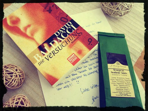 Er hat mir seinen momentanen Lieblingstee („Birnengarten“ heißt er und genauso duftet er auch!!) und eines seiner Lieblingsbücher geschickt. In dem Brief stand, dass im Buch noch ein Lesezeichen liegt, das mit dem Thema des Buches zu tun hat und dass sich der Wert vielleicht am Samstag noch steigern könnte. Mein erster Gedanke war natürlich „Hö?“, doch als ich das Buch aufklappte, sagte ich „Wie cool ist DAS denn??????“