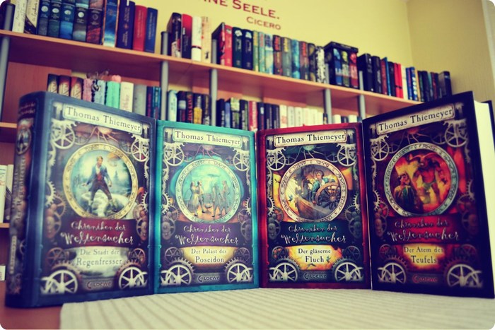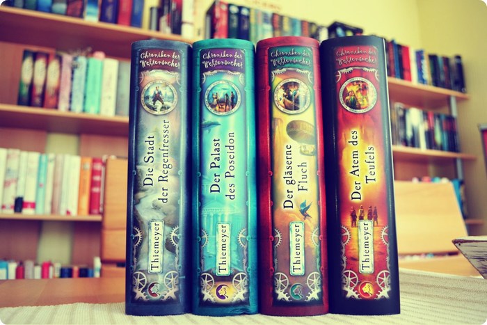 Und neben: „Das ist Splitterherz von Bettina Belitz!“, ist meine meistgeschriebene Antwort dann: „Das sind die Weltensucherchroniken von Thomas Thiemeyer!“ Und ja, ich stimme euch zu: Die Cover sind wun-der-schön!“ Und weil gestern der vierte Teil in die Läden kam, hab ich sie mal alle zusammen fotografiert: