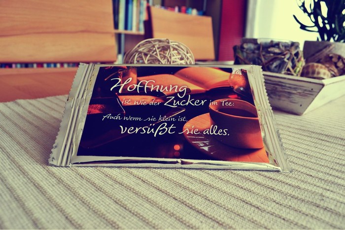 Die kleine Postkarte ist gar keine richtige Postkarte, sondern eigentlich ein Teetäschchen. Auf jeden Fall befindet sich darin loser Tee und von vorne schaut sie so aus:
