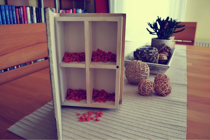 Dieses Buch passt supergut auf ein Regal, das demnächst in meinem Schlafzimmer an die Wand kommt und für das ich mir schon einige Aufbewahrungsboxen gekauft hatte. Ich hatte eigentlich vor, mir ein paar beige-braune Bücher aus meinem Bücherregal zu moppsen und diese dann auf dem Regal zu präsentieren, aber diese Box ist viel origineller und passt so supergut zu dem Rest des Raumes! Was ich in die Geheimfächer packen werde? Na Kondome natürlich! Ha … das bleibt natürlich geheim hihi