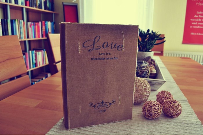 Es handelt sich hier aber nicht um den Titel eines Buches, auch wenn man es auf den ersten Blick meint. Denn das Buch ist gar kein Buch, sondern es schaut nur so aus. Es ist total auf alt gemacht und sieht aus, als wäre es in Leinen gebunden und hätte ca. 30 Jahre im vermoderten Keller verbracht (es riecht aber nicht alt hihi). Doch es handelt sich um eine Holzbox, die man öffnen kann. Dann schaut sie so aus: