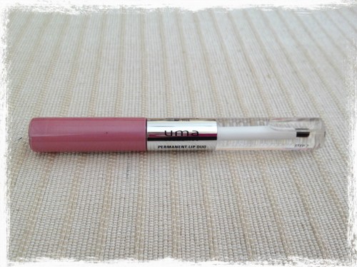 Farblich sehr abgestimmt dazu gab es ein Permanent Lip Duo von der Marke UMA COSMETICS Es handelt sich um eine Originalgröße von 20 g, die im Laden 2,98 Euro kostet. Auf der einen Seite ist der Farbgloss, den man laut Beschreibung kurz antrocknen lassen soll um ihn dann mit dem klaren Gloss im zweiten Schritt zu versiegeln. Da ich nicht so der Lipglosstyp bin, weil er bei mir meist in die … öhm … hust … kleinen Altersfältchen rund um meinen Mund läuft, habe ich ihn mal direkt aufgetragen um ihn zu testen. Die Farbe ist sehr dezent und die Konsistenz angenehm auf den Lippen. Man könnte rein theoretisch auch nur den Rosaton tragen und den Gloss am Ende weglassen. Ich habe ihn aber aufgetragen und später dann Probleme gehabt, ihn wieder runterzubekommen. Was bedeutet: Das Zeug scheint zu halten! 😉 Nur steht mir die Farbe leider nicht. Beziehungsweise trage ich normalerweise dunkleren Lippenstift und da ich ja so ein Gewohnheitstier bin, mag ich mich mit hellen Lippenstiften nicht so. Aber ich werde mal was ganz anderes testen und zwar, den Gloss über meine normalen Lippenstifte aufzutragen, so dass sie dann vielleicht auch länger halten!