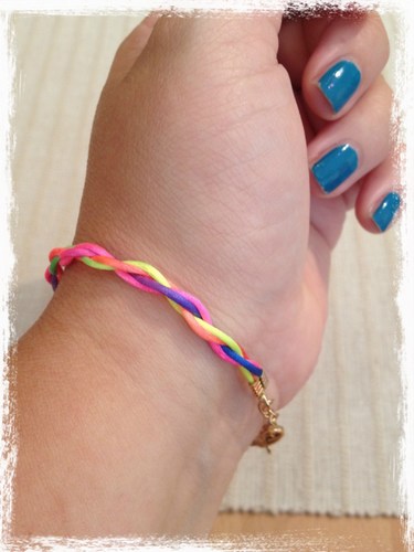 Eine Art Freundschaftsband in Neonfarben. Yeeeah, let’s go back to the 80th! 🙂 Ich hab es mal direkt umgemacht und werde es tragen, bis es von alleine abfällt. Es kommt mir nämlich nicht soooo stabil vor. Aber schauen wir mal! Leider sieht man auf dem Foto übrigens nicht, wie waaaaaaaaaaaahnsinnig sonnengebräunt ich bin. Das verstärkt nämlich den Neoneffekt noch! 😀