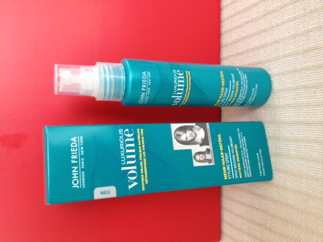 Das zweite Produkt klingt schon eher kossilistisch. Zumindest werde ich es mal testen. Es handelt sich um das Luxurious Volume Styling Spray von John Frieda, für das die Leute ohne die DM-Box im Laden 5,95 Euro hinlegen müssen: