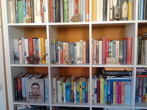 Zum Abschluß ein Blick in mein Bücherregal, daran sieht man das ich eine echte Querleserin bin. Ich brauch halt die Abwechslung. Aber da passt Mole ja gut rein, so viele verschiedene Bücher wie da drin sind, das geht in kein Regal!