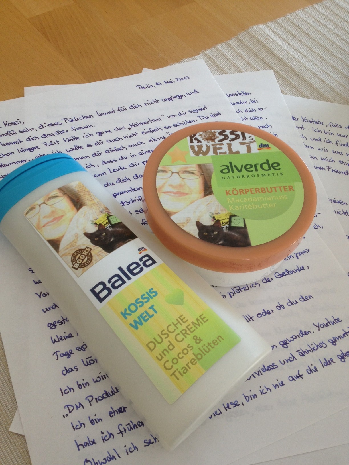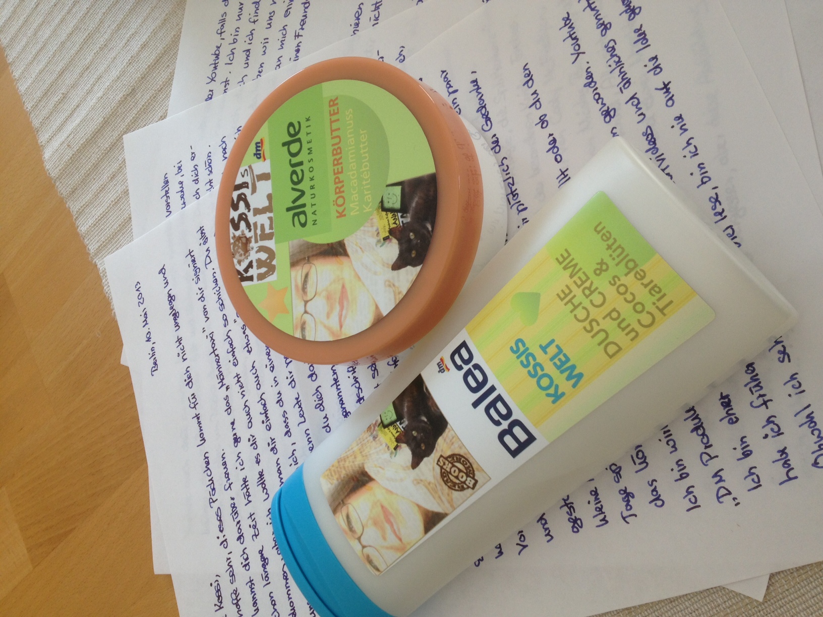 Das zweite Päckchen kam von Lena, die mir nicht nur einen fast 3 Seiten langen Brief MIT DER HAND geschrieben hat, sondern mir auch noch bei DM „Kossis Welt“-Produkte hat machen lassen. Und mit den Duftrichtungen hat sie auch noch genau meinen Geschmack getroffen!! Ich hatte von dieser DM-Aktion schon mal gehört, aber noch nieeeee mein eigenes Duschgel und Körperbutterzeugs gehabt. Eigentlich ist es fast zu schade, es zu benutzen 🙂