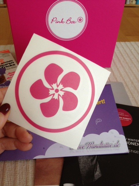 Und als ich so die Gutscheine an die Seite packte, fühlte ich an dem 40%-Gutschein, dass da irgendwas drin ist. Also öffnete ich ihn und siehe da … drin befand sich (weil es sich um eine Wandtattoo-Seite handelt) ein … tadaaaa … Pink-Box-Blumen-Wandtattoo. Das finde ich richtig chic. So in Pink und so. Wird sicher einen Platz in meinem Badezimmer finden oder irgendwo anders: