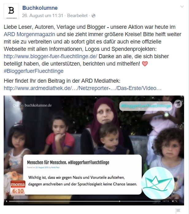 „Liebe Leser, Autoren, Verlage und Blogger – unsere Aktion war heute im ARD Morgenmagazin und sie zieht immer größere Kreise! Bitte helft weiter mit sie zu verbreiten und ab sofort gibt es dafür auch eine offizielle Webseite mit allen Informationen, Logos und Spendenprojekten:http://www.blogger-fuer-fluechtlinge.de/ Danke an alle, die sich bisher beteiligt haben, die unterstützen, berichten und mithelfen! <3 #BloggerfuerFluechtlinge