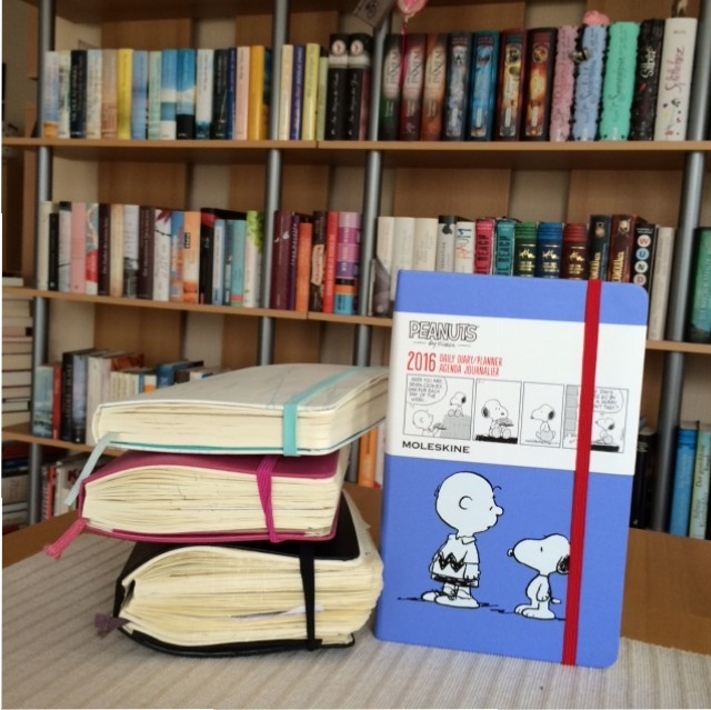Ich habe zu diesem Zweck immer Moleskines gekauft, weil sie mir einfach am besten gefallen und weil sie total stabil sind. Das Buch aus dem Jahre 2013 ist auf ein Vierfaches gewachsen zum Ende des Jahres 🙂 Ich habe darin viele Fotos, Briefe, Karten usw. aufbewahrt. Und wie ihr seht, ist es immer noch nicht auseinandergefallen.
