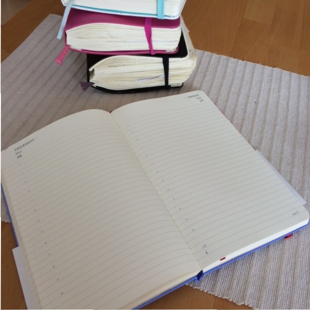 Diese großen Tageskalender sind für mich einfach superpraktisch, weil ich für jeden Tag eine ganze Seite zur Verfügung habe. Auch Samstags und Sonntags! Sollte der Platz mal nicht reichen, klebe ich DIN A 4-Seiten ein, auf denen ich für den Tag dann weiterschreibe.